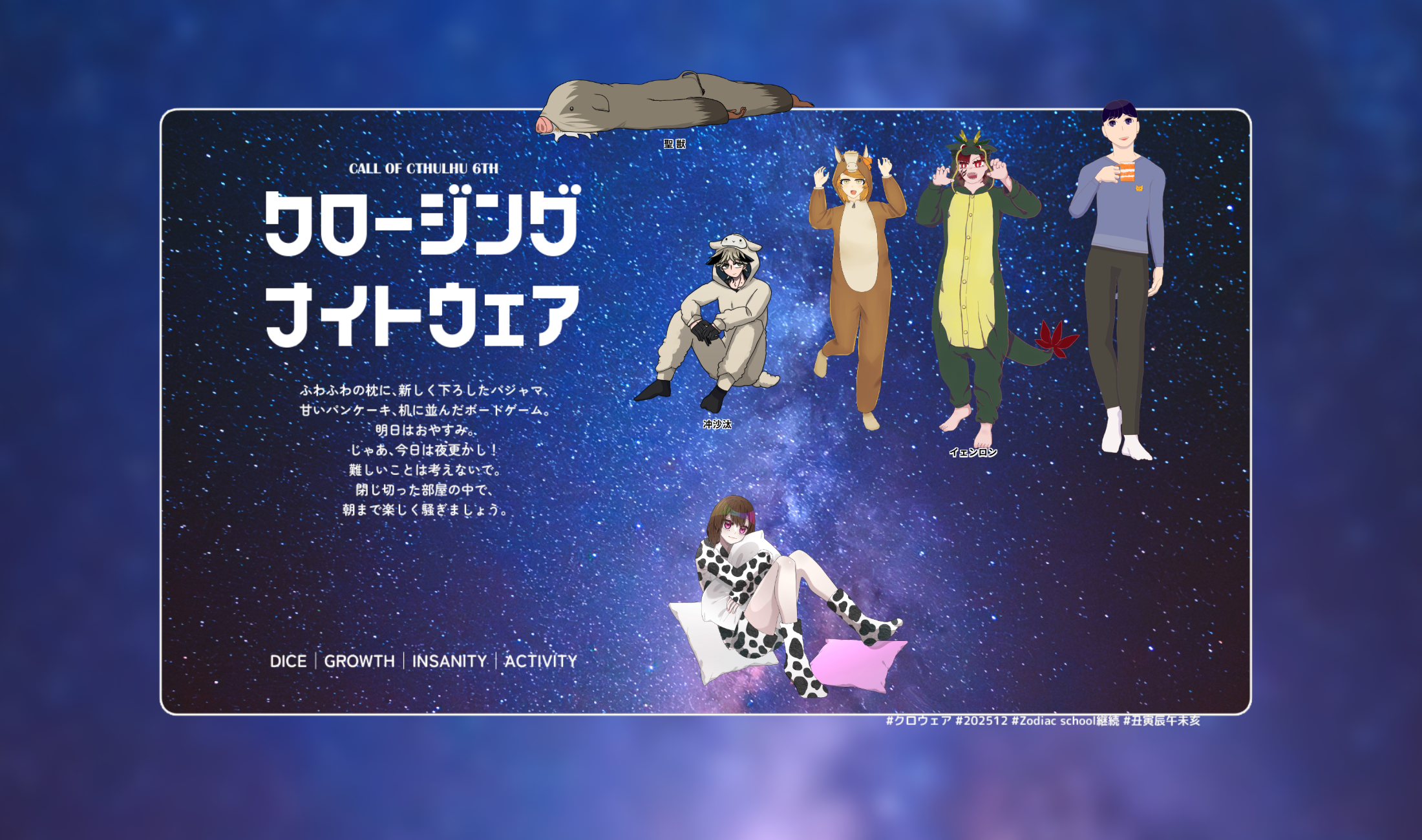 2025/12/03 卓報告 CoC「クロージング・ナイトウェア」 KP: 🐏ヨズト PL:※十二支順 🐮葦原さん 🐅海音さん 🐴ねこ塩さん 🐗あイだっジさん 記念写真参加:🐉 2025/12/02~04(全2回) END:グッドモーニング・エブリウェア #ムナサタ #ゾディアックスクール #KP スクショ・定位置についてるver thanks!