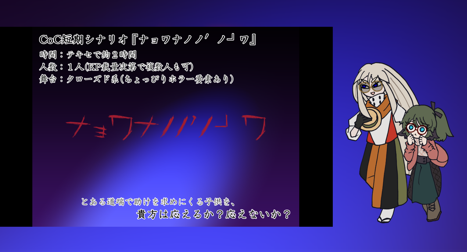 2025/12/08 卓報告 CoC「ナョワナノノ′ノ┘ワ 」 KP:あイだっジさん PC:富士見ヌイ・誤問ヘンリー(PLヨズト) 2025/12/07 探索者生還 #ヌイ #ヘンリー 閲覧注意 1PL2PCで挑むナョワ!ヌイがボケ・慣れてる探索者RP、ヘンリーがツッコミ・慣れてない探索者RP! 近ごろ自分が裏バイト:逃亡禁止をオススメしてまわってたところ、このシナリオ回したくなった!とのことでVERY HAPPY…!!!! ちなみにロストは~ちょっと危ないところでした!ヒィ!thanks!