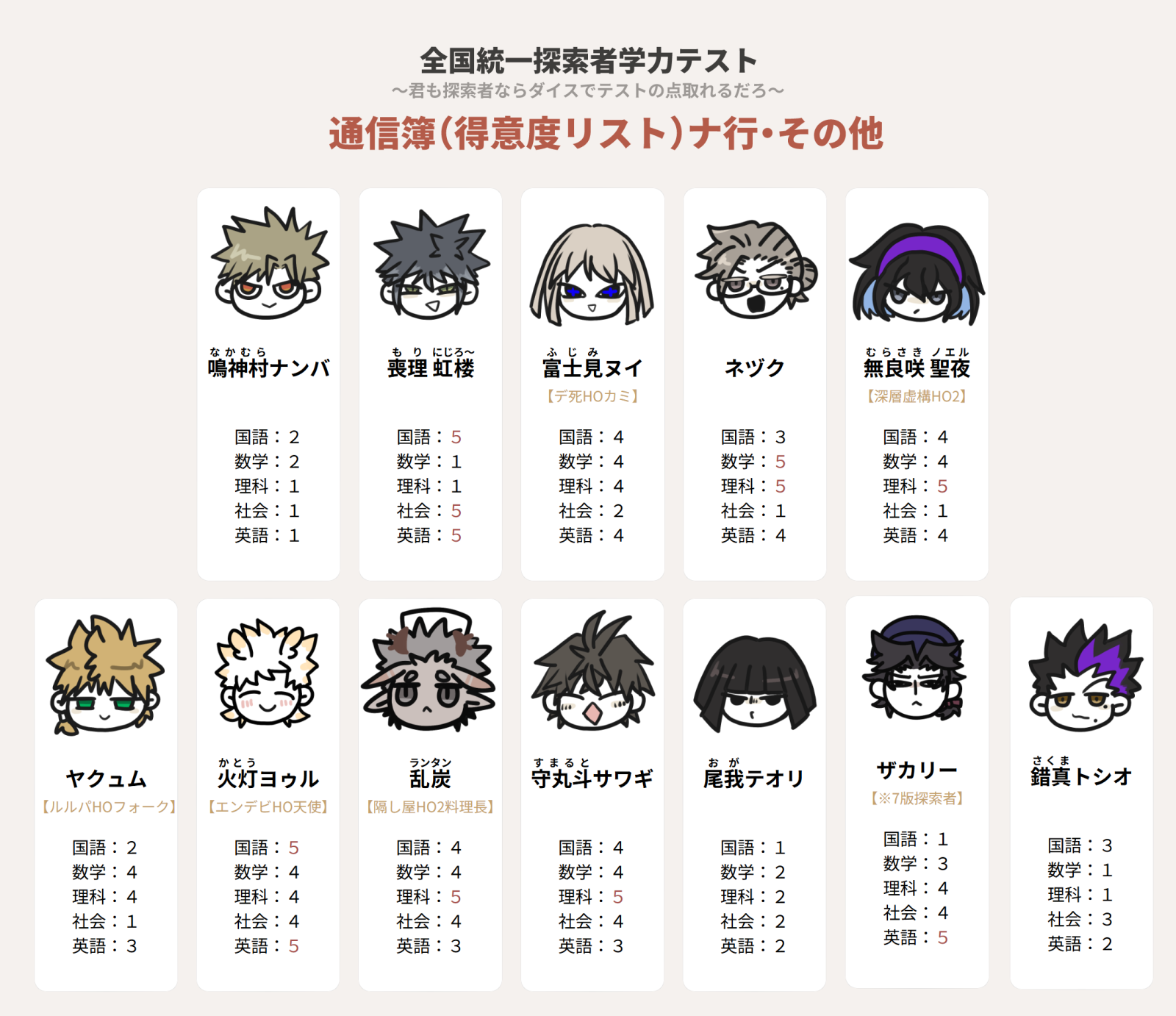 2025/12/30 設定メモ #ずよ宅集合 #学力テスト https://50on.jackrown.com/?postid=1287 上記記事で使った、得意度のリスト HTMLで用意してたキャラ紹介ページ改造してつくった