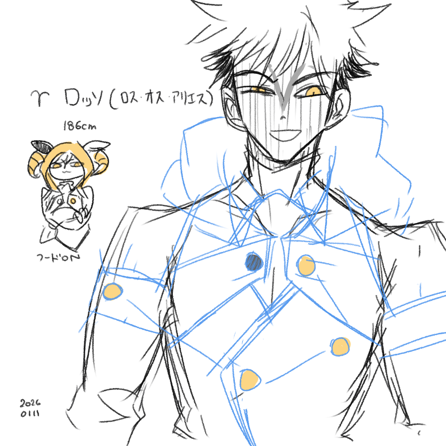 2026/01/11 設定メモ #ロッソ 金ボタンの位置を牡羊座にしようと思ってる 逆三角形体型を練習しようかと思ったらキャンパスに入り切らずに挫折し、じゃあ服のデザイン考えるかと方向転換した絵なのである