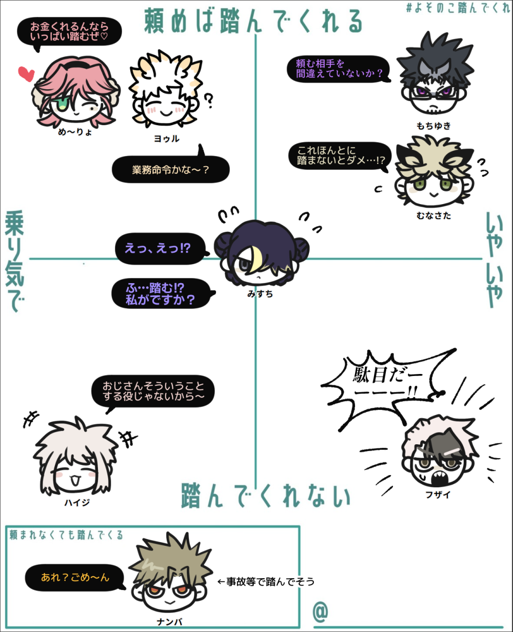 2025/10/30 テンプレ 「よそのこ踏んでくれ 」お借りしました! #め~りょ ノリノリの所「金あげるからあれも踏んでよ」等と無茶振りしたい(泣く) #ヨゥル ス…て踏んでくれそう #ムナサタ 困惑し、此方への説得を試みる #ハイジ のらりくらりかわしそう #ナンバ 事故踏みイメージある #もちゆき 状況把握爆速人間だから踏んでくれる 覚悟決めたら余計な逡巡はしない 顔はド・嫌そうを希望します #みすち 「だめです!」と「><」の顔でドン!とつっぱねてほしいシーンが存在する #フザイ 感性まとも枠として扱ってるけどこの人探索に出すとどんな状況でも常大声だからよろしくない大人だよ