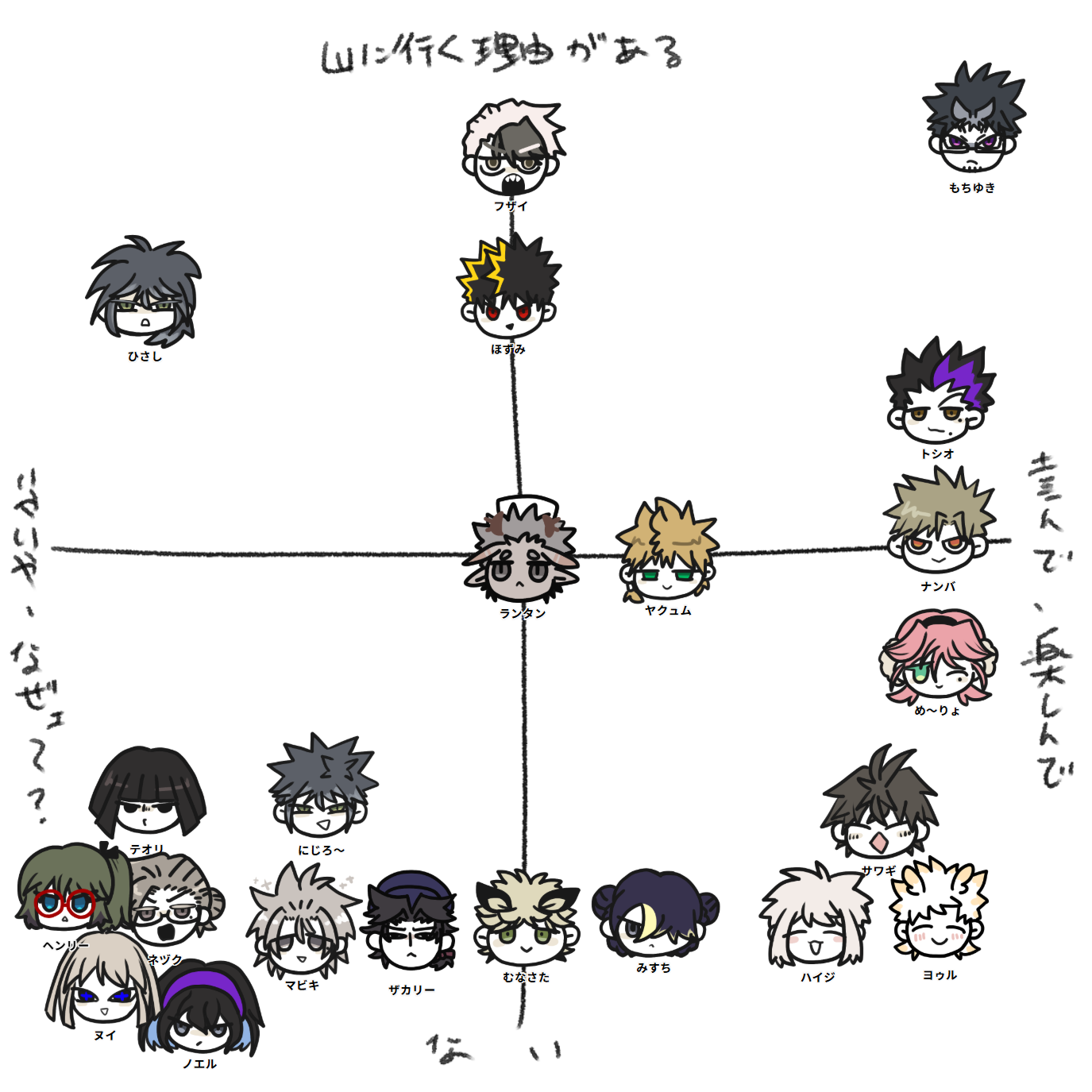 2025/11/22 テンプレ #1116山 雑につくったテンプレ 山に行くかどうか #め~りょ 山には喜んで行くと思う 幻覚キノコを採りにいこうぜ(アウトローっぽい理由を考えている)何かの案件の帰り道に通りかかったとかでも全然ありそうだし、紅葉狩りに行こうぜでも着いていく #もちゆき ウッキウキで山へ向かうまもち! #ヨゥル 絶対その服山にそぐわないけど笑顔でスキップしていくのが想像できる! #ほずみ #ひさし 警察組は仕事で山行くこともあるだろう、しょぼついた顔をしててくれ! 右下に居る連中は山に放り込んで泣かせよう!