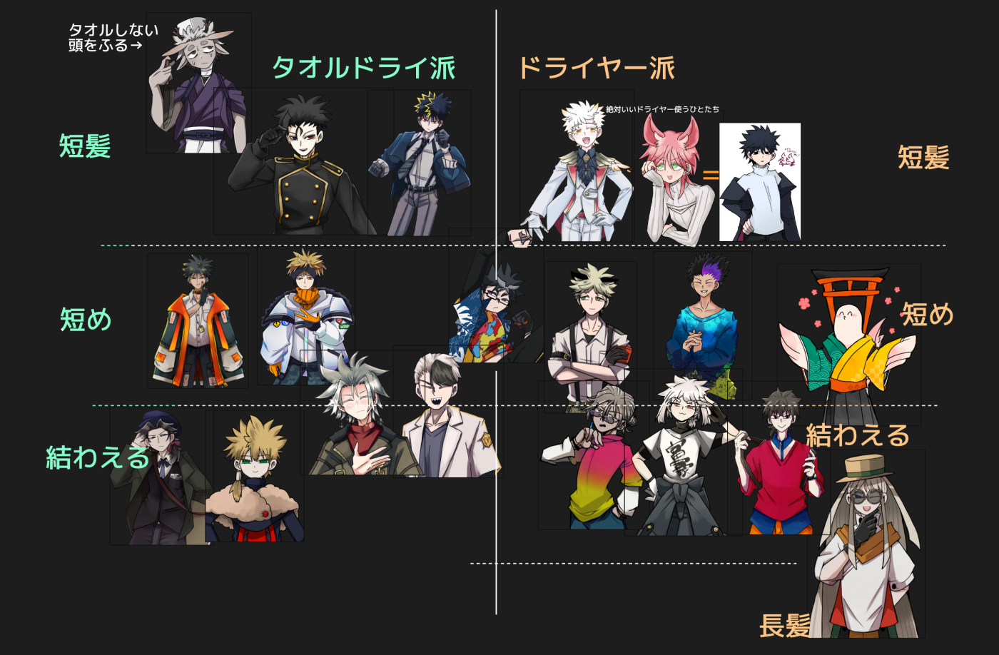 2026/01/27 テンプレ ドライヤー使いますか?で雑にまとめたやつ 時代や舞台設定的にドライヤーない人たちもいる #ランタン 頭プルプルするだけ #もちゆき 真ん中ぶち抜いてるけど無かったら文句はいうしあってもボロドライヤーだったら凄く文句つける #ムナサタ 最近使うようになった #うかい いっちょ前に使うのか…