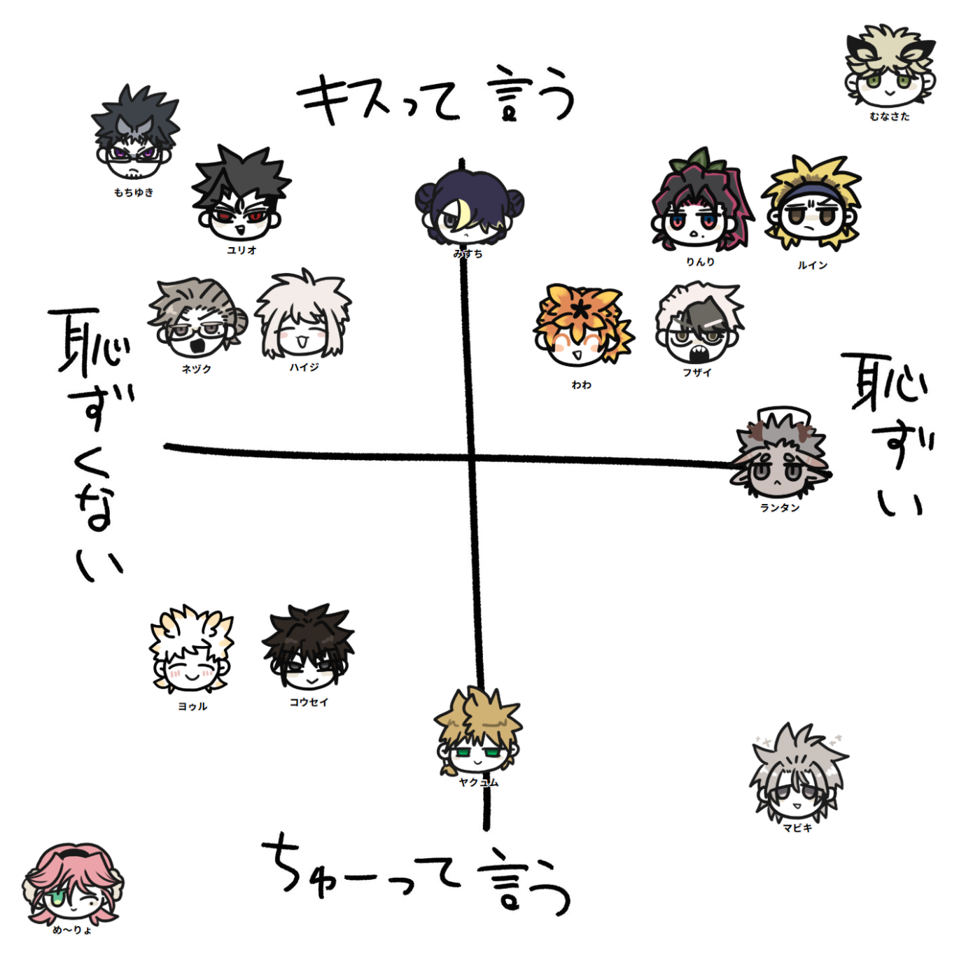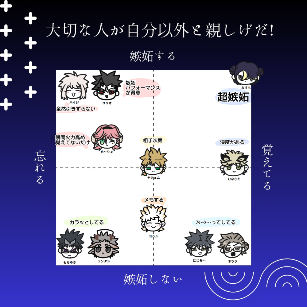 2026/02/14 テンプレ 大切な人が自分以外と親しげだ! ~嫉妬する人たち~ #ハイジ 本編参照 #ユリオ そういう態度で翻弄しそう #め~りょ 思い出すたびに言及してきそう #ヤクュム 仲いい子同士なら嬉しそうに見てる #みすち 一番嫉妬する #ムナサタ もにゃ…とするけど口にはしなさそう ~嫉妬しない人たち~ #もちゆき 絶対しない。嫉妬しなさすぎて試されそう #ランタン わしだけのものじゃないし感 #ヨゥル メモ言及してもらえて嬉しかった…メモをします #にじろ~ 対人関係は明るめなので嫉妬しない #ネヅク 嫉妬できる立場にはないので嫉妬しない