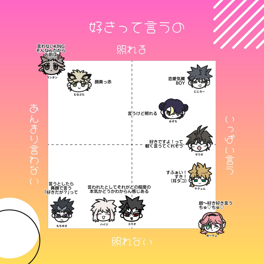 2026/02/14 テンプレ 好きって言うの ~照れる人たち~ #ランタン あんまり言わない。そんなんだからお前はNTRHO #ムナサタ 照れるから言えない健全な男子 #みすち 好きです!!って汗いっぱいエフェクトつきで言う #にじろ~ ほっぺ赤くしながら言う差分 #サワギ 恥じらいはあるが軽い ~照れない人たち~ #もちゆき 怖い #ハイジ こいつに「好きだよ~」って言われて本気にできるかどうか試される #ユリオ こいつに「好きだよ~」って言われてガチで言ってると思えるかどうか #ヤクュム 1日10回言ってそう #め~りょ 四方八方に言い過ぎてありがたみがない