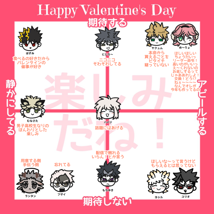 2026/02/17 テンプレ 自分がつくったテンプレ ~期待する人たち~ #ほずみ フンフン🎶と楽しみにしてる #にじろ~ アピールはするけど貰えたらウレシ程度 #ヤクュム ドソワソワ #め~りょ 貰う気ありすぎ #ムナサタ もらえるといいな…! #ハイジ そういえばそろそろバレンタインだっけ~?という触れ方 ~期待しない人たち~ #ランタン つくる側 #フザイ 仕事で忙しく… #もちゆき 「お返しが大変だから送るな!」って画面に言う #ヨゥル え~くれないの~?って言うくせに #ユリオ 僕もらってあげよっか~?って言うくせに