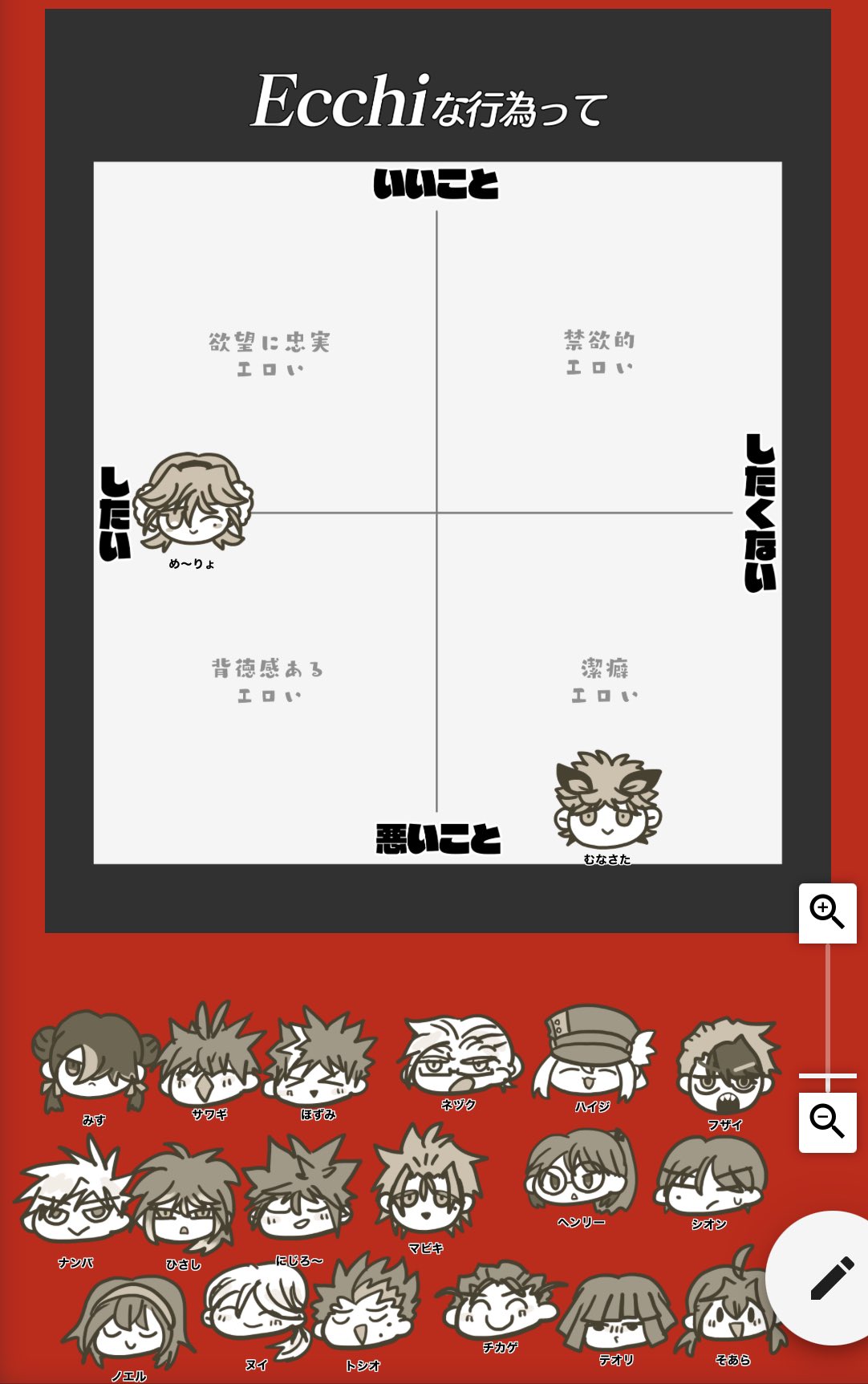 2025/03/15 テンプレ 「えっち」「エロ」「すけべ」「変態」自PCはどれ言いそう教えてテンプレート 内訳描いたよ! #漫画 ・えっち派 #め~りょ #サワギ ・エロ派 #にじろ~ #ネヅク ・スケベ派 #みすち #フザイ #ムナサタ ・変態 #ひさし #ハイジ #ほずみ ・その他 #マビキ (語彙を持たないタイプ) みすちは「助平(すけべ)」って言うだろ…………