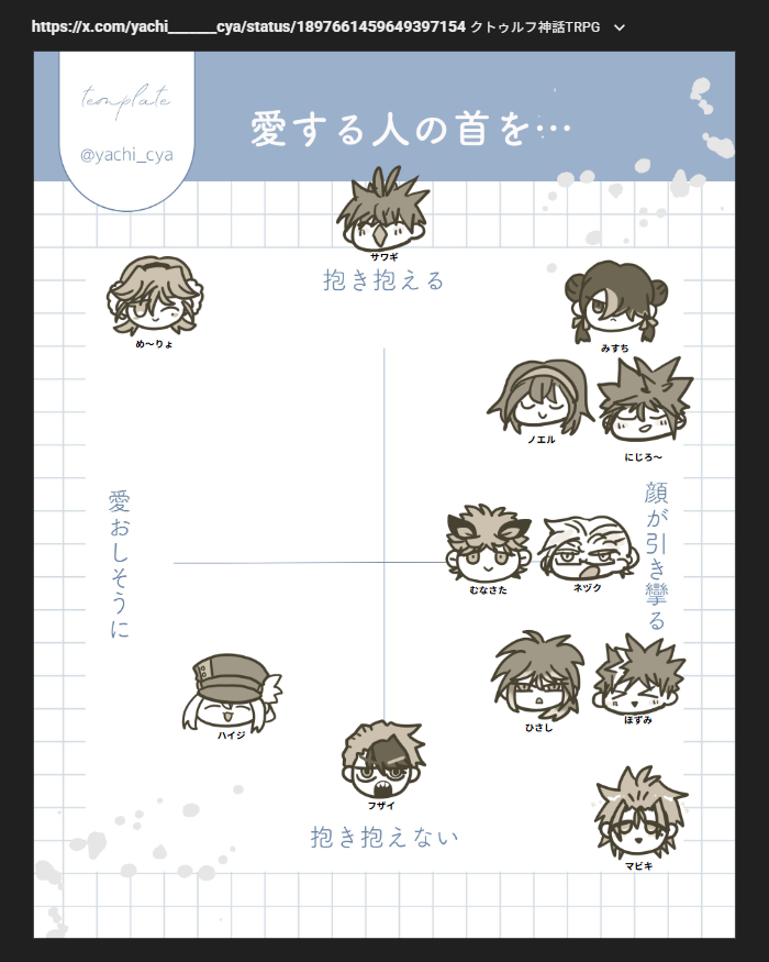 2025/03/10 テンプレ こちら、ホンマに頼みます 生首ネタ大好き大好き大好きー!! 愛する人、大切な人、家族、友達…と対象を広げて ~愛おしそうライン~ #め~りょ 愛おしそうに抱きかかえるのはお前だけ #ハイジ 案外「お^^」という感じになりそう。それがアンドロイドでも人間でも。 #サワギ 真ん中ド上、生首を抱えあげるから。顔は笑ってそう(笑い泣きの場合もある) #フザイ 真ん中下、フラットな顔で首を見下ろしてそう ~顔が引き攣る~ #みすち #ノエル #にじろ~ ド泣き青ざめ発狂がよく似合う #ムナサタ #ネヅク 絶望顔が似合う。生首を抱っこはせずとも手には持ってくれそう #ひさし #ほずみ 刑事組はまさに「引き攣る」顔があう #マビキ きらめく涙をこぼしながらイヤッイヤッと事実を認めず相手の首を見下ろしてほしい