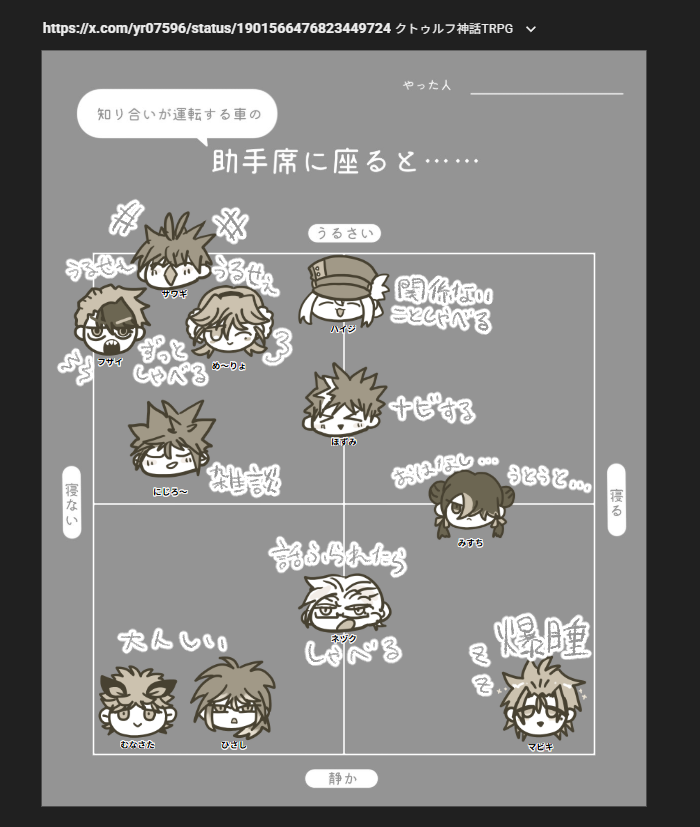 2025/03/19 テンプレ 助手席に座ると… #サワギ 一番うるせ~!気が散る"気づき"が多い「大きい犬が散歩してます!」 #フザイ いちいちうるさい「制限速度超えてるぞーーっ!!」 #め~りょ 後部座席側にちょっかいだして大騒ぎする #にじろ~ 現在位置にあわせた雑学調べて話してくれる。地名とか #ハイジ 関係ないことずっと喋る、疲れてたら寝る #ほずみ ナビしてくれる、疲れてたら寝る #みすち おはなし一生懸命するけど運転次第でいつのまにか寝てる #ネヅク 話ふられたら喋る、静かだとそのうち寝る #ムナサタ 借りてきた猫のようにずっと大人しい #ひさし ずっと何か食べてる #マビキ すぐスヤスヤする