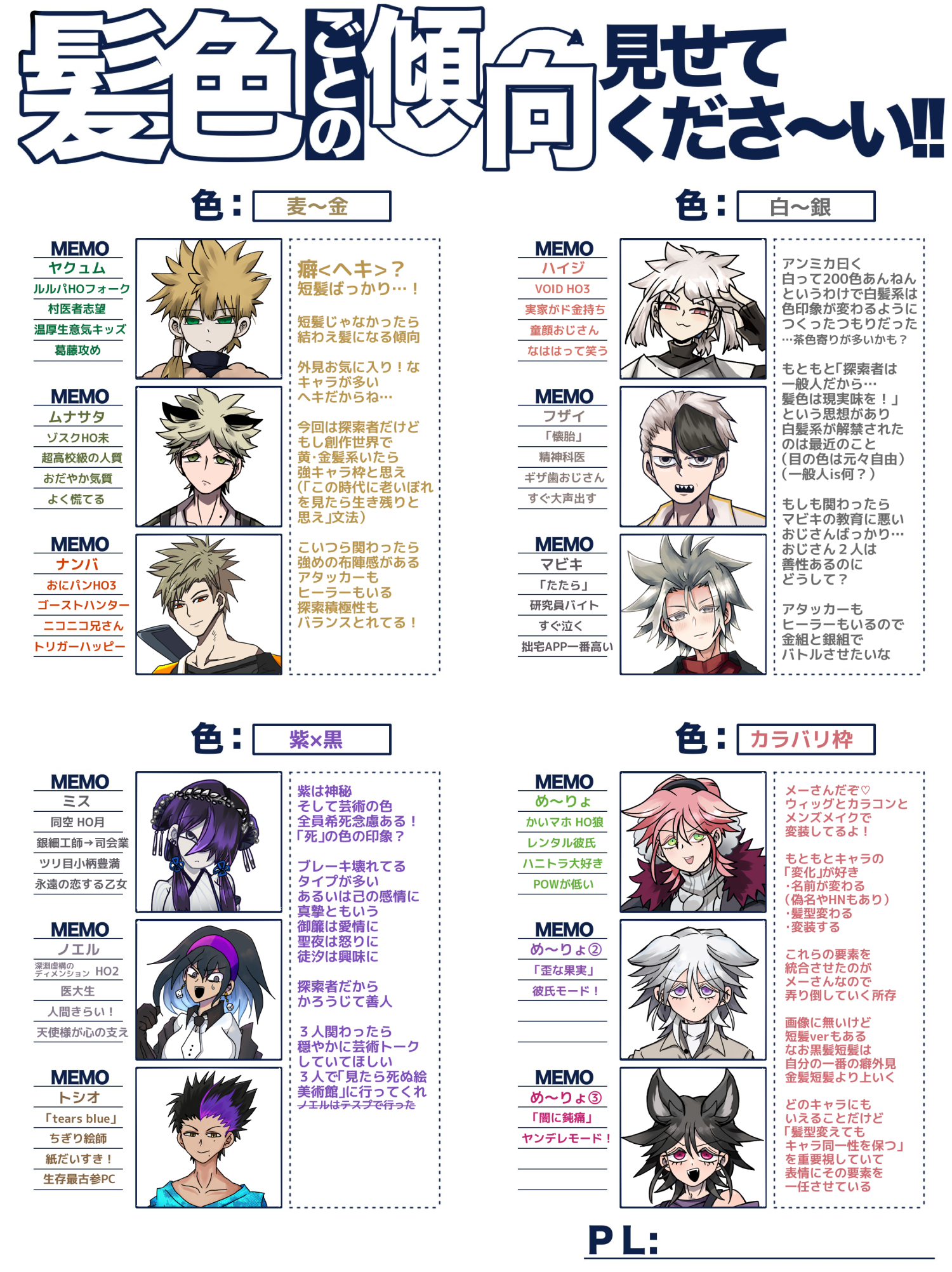 2025/05/20 テンプレ 髪色ごとの傾向見せてください 配布元よりそこ関わったらどうなっちゃうの!?という話題フリがあったので記述有り! 金組 #ヤクュム #ムナサタ #ナンバ 銀組 #ハイジ フザイ ナンバ 紫組 #みすち #ノエル #トシオ カラバリ枠 #め~りょ メーはいつかひとりで7色揃えたいね!!