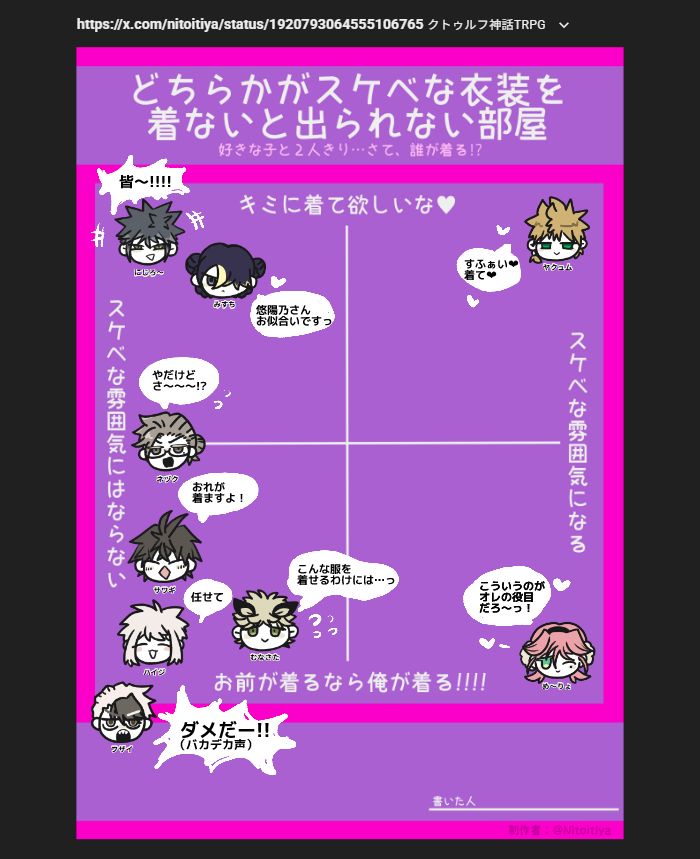 2025/06/07 テンプレ どちらかがスケベな衣装を着ないと出られない部屋 好きな子に限らず(仲間・友達含む)スケベな衣装を誰かが着ないと!! #にじろ~ 周囲に積極的に着せる邪悪 #みすち スケベ心なく相手に着てほしい #ヤクュム スケベ目的 #め~りょ スケベ目的、あとほんとに自分が似合うと思って着る #ネヅク 着ないとどうにもならなければ着る #サワギ 泥をかぶろうとする善意 #ハイジ 謎に積極性を見せる #ムナサタ 人質精神 #フザイ ダメだー!!って取り上げて自分で着てダメだーーーッてなる PLだってフザイ先生のスケベ衣装はまったく見たくないよ!泣きわめく様が面白そうなだけ