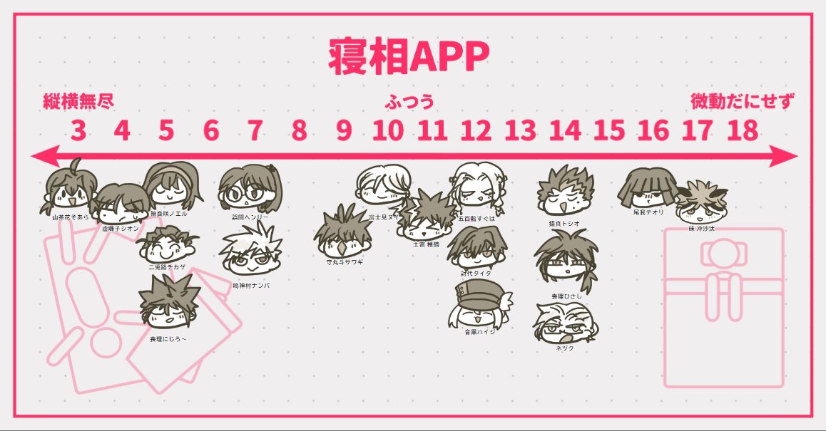 2024/11/21 テンプレ 寝相APP(CoC勢向け) 2024/09/10 配布元 @wokochimaru まとも面してる連中がことごとく出目悪くてこいつら…てなりました 微動だにせず #ムナサタ 完全解釈一致、綺麗そう #テオリ 寝姿が汚いと親から怒られてそう #トシオ 意外にも綺麗なんだ #ひさし さすがひさねぇ! #ネヅク 横に丸まって寝る/寝相良い/寝言言わない/電気つけて寝る/眠りが浅い/寝起きいい -----ふつうの壁----- #すぐは イメージぴったり #タイタ 寝相悪い時は自己嫌悪に陥りそう #ハイジ よきベッドで快適睡眠 #ほずみ 刑事系の中では低め #ヌイ 静かに寝てそう #サワギ お前は寝相悪い方がそれっぽいだろ! -----悪めの壁----- #ヘンリー 布団といっしょにくちゃくちゃになってる #ナンバ 寝相も寝言もすごそう #ノエル ストレスの現れとか言い訳しそう #チカゲ 自分でも気にしてて起きた時に「あれ?」となってそう #にじろ~ 雑魚寝したらその場を荒らすキング #シオン 真面目ツラして寝姿やばいんだ #そあら 一番縦横無尽でキッズはかわいいね