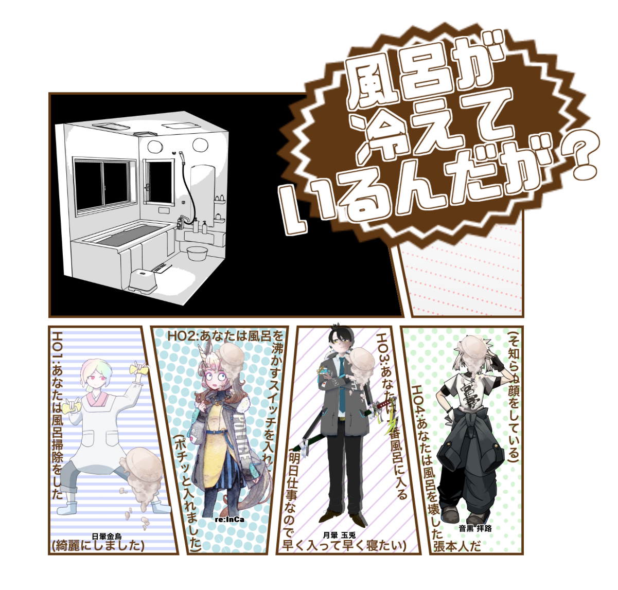 2025/05/19 卓報告 クトゥルフ神話TRPG「風呂が冷えているんだが?」 ※過去分掲載 KP:夜明 涼さん H01:日量 金烏 / 柳 雪雫さん HO2: re:InCa / 神無月ちこさん HO3:月量 玉 / せいふうさん H04:音黒ハイジ / ヨズト 2024/08/24・25 #ハイジ #発光班 #風呂冷え